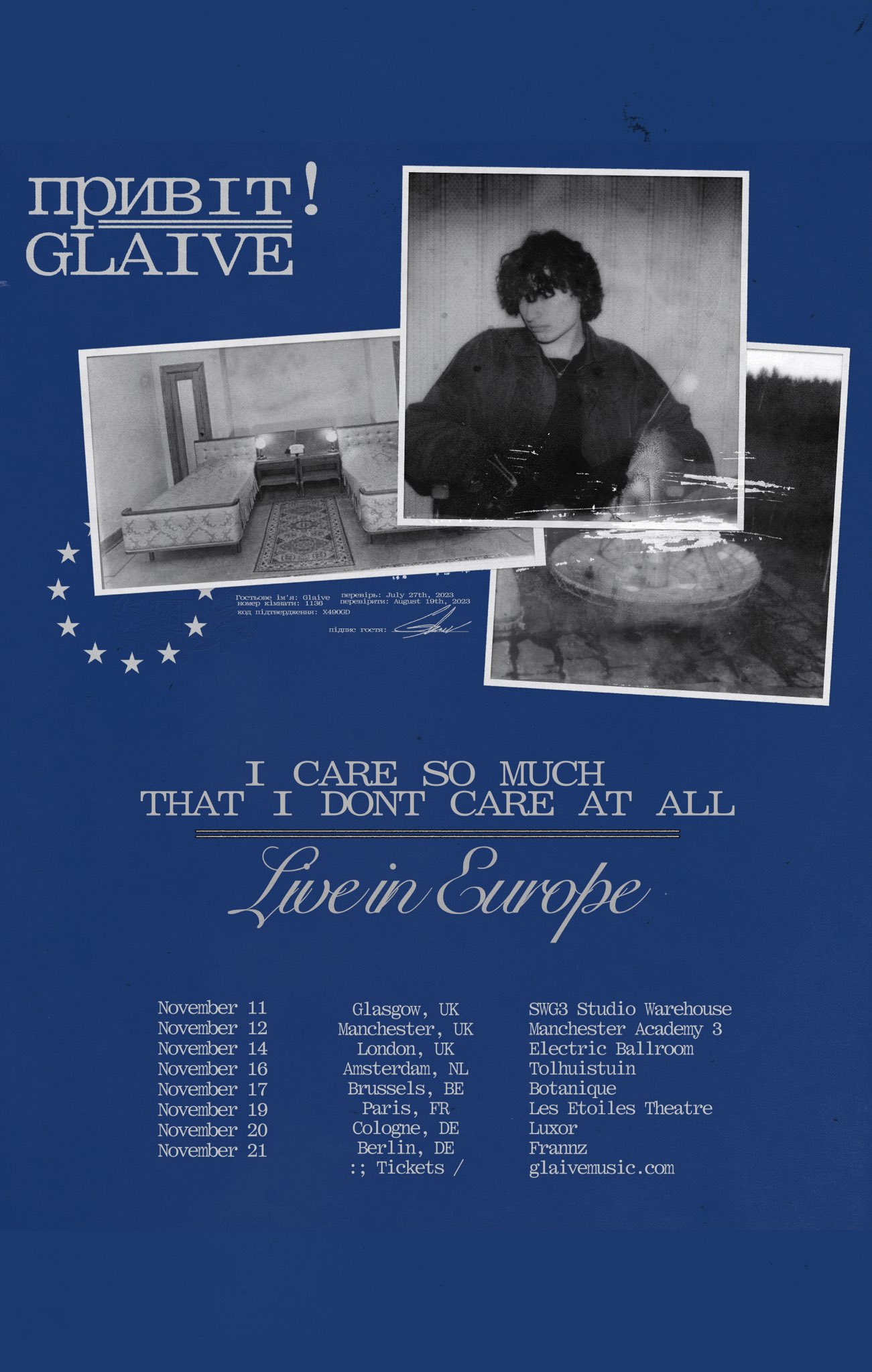 Glaive has gone on a few tours and has gone on tour with other artists such as ericdoa and The Kid LAROI. Glaive has two upcoming tours where he will be having concerts in The United States aswell as Europe. This tour was announced at the same time as he announced his debut album "i care so much that i dont care at all".